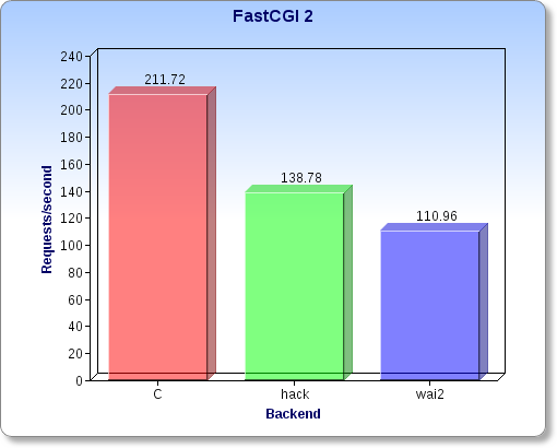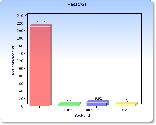 This is where things start getting depressing. The C library is performing incredibly well, and yet none of the Haskell libraries can keep up. WAI is merely a wrapper around direct-fastcgi, so that result isn't surprising. direct-fastcgi is a pure Haskell implementation of the FastCGI protocol; given its relative immaturity, it's not surprising that it hasn't been optimized yet.