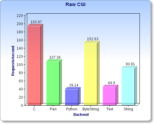 For our purposes, we'll start by comparing raw CGI output. By raw, I mean simply printing to stdout without using a package. There are six different results in this benchmark: C, Perl, Python are obvious. There are then three versions of the Haskell benchmark for bytestrings, text and strings. Here's the graph, higher numbers are better.