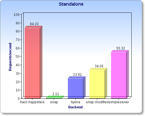Even so, the Snap results are much less than expected. I was in touch with Gregory Collins about this, and he found one performance bug almost immediately that gave the numbers a 40% boost. Moral of the story: Snap has a lot of potential, but it's still very young.