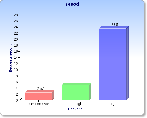 - Yesod performs fairly well on CGI, but hopefully will benefit from speed improvements in wai-handler-fastcgi in the future.