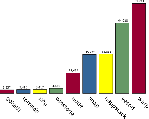 The test results above were run against an Amazon EC2 extra large instance. I ran the tests on a micro instance as well. However, due to lower RAM, some of the non-Haskell servers fared very poorly, and I decided to only publish the extra large instance results for now. As usual, results will vary based on the setup you run it on, but so far in every setting Warp comes in at least twice as fast as the next contender (excluding Yesod... I'll explain that in a second).